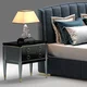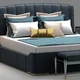 The Zaffiro bed from the Galimberti Nino factory has a closed "boat" structure and a high, slightly curved upward headboard with a longitudinal tie.