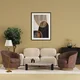A cozy living room with a plush beige sofa, two brown velvet swivel chairs, and a rustic wood coffee table. A gold-accented floor lamp, abstract wall art, and elegant decor create a warm and sophisticated ambiance.