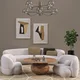 This modern living room features a curved white sofa, flanked by two plush gray armchairs. Two framed abstract art pieces hang on a taupe wall, complementing the neutral palette. A potted plant adds a touch of greenery, while a patterned rug ties the elements together, creating a chic and inviting atmosphere.