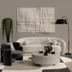 Sleek, modern living room with a neutral palette. Creamy sofa anchors the space, paired with a charcoal armchair. Sculptural wall art adds depth. A round, stone coffee table holds candles and flowers.