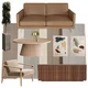 This Scandinavian living room features a warm, earthy palette with beige and brown tones. Natural wood furniture, a leather sofa, and minimalist armchairs create a cozy yet modern look. A textured rug, abstract wall art, and subtle decor enhance the space’s elegance.