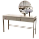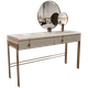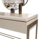 Designed by Carpanese Home, Althea V is a vanity desk featuring rigorous shapes and curvilinear details. Two original metal inlays are wrapped around the entire desk, from the top to the drawers, forming two practical handles. Two drawers contain a jewelry box and ring holder upholstered in econabuk and there are two circular mirrors of different sizes, emphasizing the aesthetic / functional balance of the vanity desk.