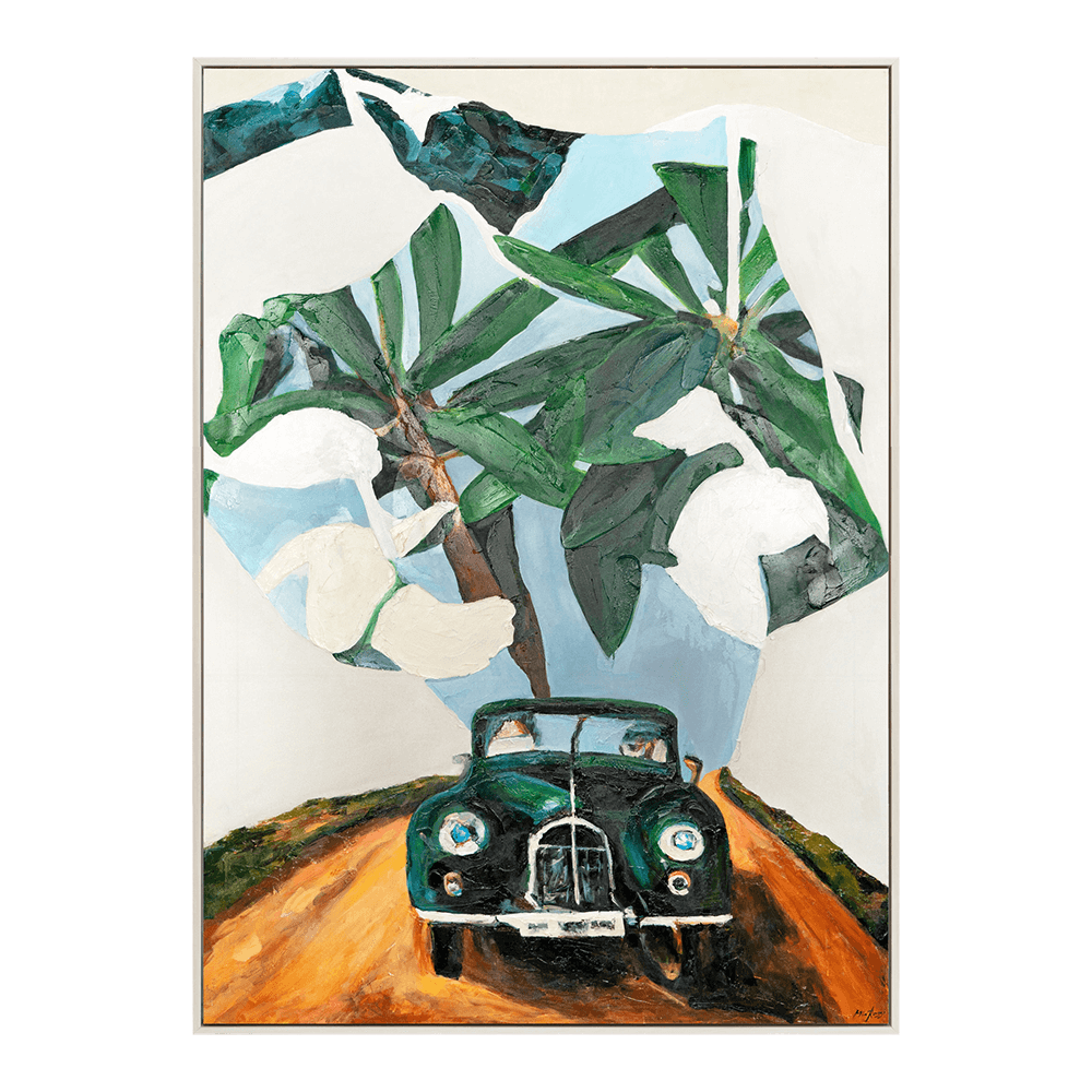 This painting depicts a classic car speeding down a red road under large green leaves of exotic plants. The upper part of the composition resembles a collage or a memory, where palm leaves and flowers merge with the sky. The car in the center seems to symbolize escape, adventure or a romantic past - all conveyed with bright strokes and a vibrant palette.