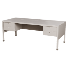 Executive desks covered in leather throughout ,with end base plinth in aluminium or polished brass. One or two drawerboxes can be installed under the top.