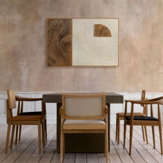 “Lines and Circle” is a combination of the natural texture of wood and the architectural clarity of form. The painting unites two elements — organicity and order. The left side of the canvas conveys the movement and warmth of wooden waves, while the right side creates balance through geometric structures and minimalist colors.