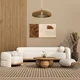 A serene Japandi living room with soft neutral tones, sculptural cream sofa, rounded wooden coffee table, woven pendant light, textured wall art, and natural fabrics creating a calm, warm, minimalist atmosphere.