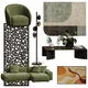 This living room set features a calm, balanced composition with earthy tones and soft textures. The olive-green upholstered sofa and armchair add depth and comfort, while the abstract wall art and perforated decorative panel create visual interest.