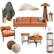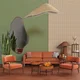 A cozy living room set with warm earthy tones, featuring a terracotta sofa and matching armchairs with wooden frames. Natural textures, woven lamps, organic decor, and greenery create a calm, inviting atmosphere balanced by soft lighting and clean lines.