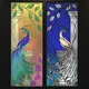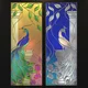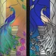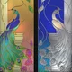Two glass stained-glass windows with floral patterns and a peacock. Available in two color options and two sizes (400 x 1070 mm and 600 x 1600 mm). One stained-glass window is bright, golden-green with a blue-green peacock. The other is more modest, with a blue background color and silver-gray shades prevailing.