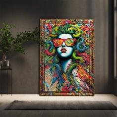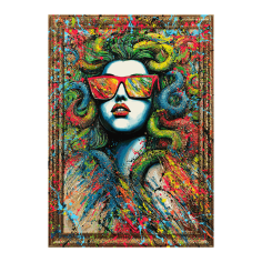 An extravagant image of a modern Medusa Gorgon wearing sunglasses. The combination of street aesthetics, pop art and neon splashes creates an explosive effect that attracts the eye. Bright colors, aggressive texture and dynamics of strokes make this painting a real art object for bold spaces.