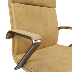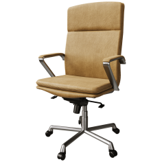 Soft leather covering. Armrests completely covered in leather or chromed aluminum. Articulated structure in polished aluminum. Base in polished aluminium or black lacquered.