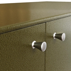 This collection, with its contemporary design, includes a range of desks and conference tables with hard leather or glass tops and bases in stainless steel, silver anodized aluminium or fine-ribbed hard leather. The cabinets, drawer cabinets and bookcase panels are fully covered in hard leather.