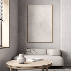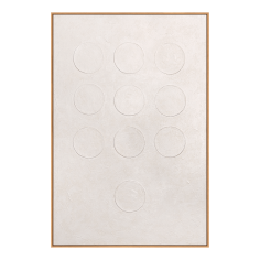 “White Code” is the embodiment of silence and purity. Nine embossed circles carved into the soft texture of the canvas create a sense of order, harmony, and tranquility. Light playing on the surface changes the perception of volume, transforming a simple form into a meditative composition.