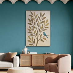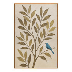 “Whisper of Leaves” is a delicate story about the peace and harmony of nature. A blue bird, a symbol of lightness, hope, and inner peace, sits on the branches of a tree painted in warm shades of olive and beige. The textured surface creates a sense of living presence, as if a light breeze is touching each leaf.