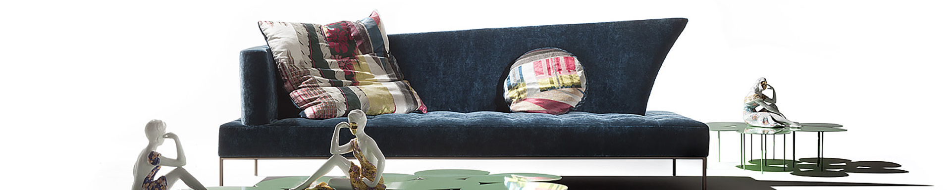 Sofas, armchairs, and chaise-longues form the basis of the collection, which are enriched by accessories like tables, lamps, poufs, and hand-knotted carpets.