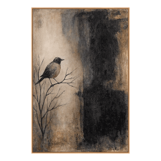 “Branch and Shadow” is a painting that combines the symbolism of nature and the power of contrast. A bird sits on a branch drawn with thin lines, standing out against a background of deep black and warm beige-brown tones. It seems to embody calm amid darkness, while the textured surface of the canvas enhances the liveliness of the scene and makes the composition expressive and profound.