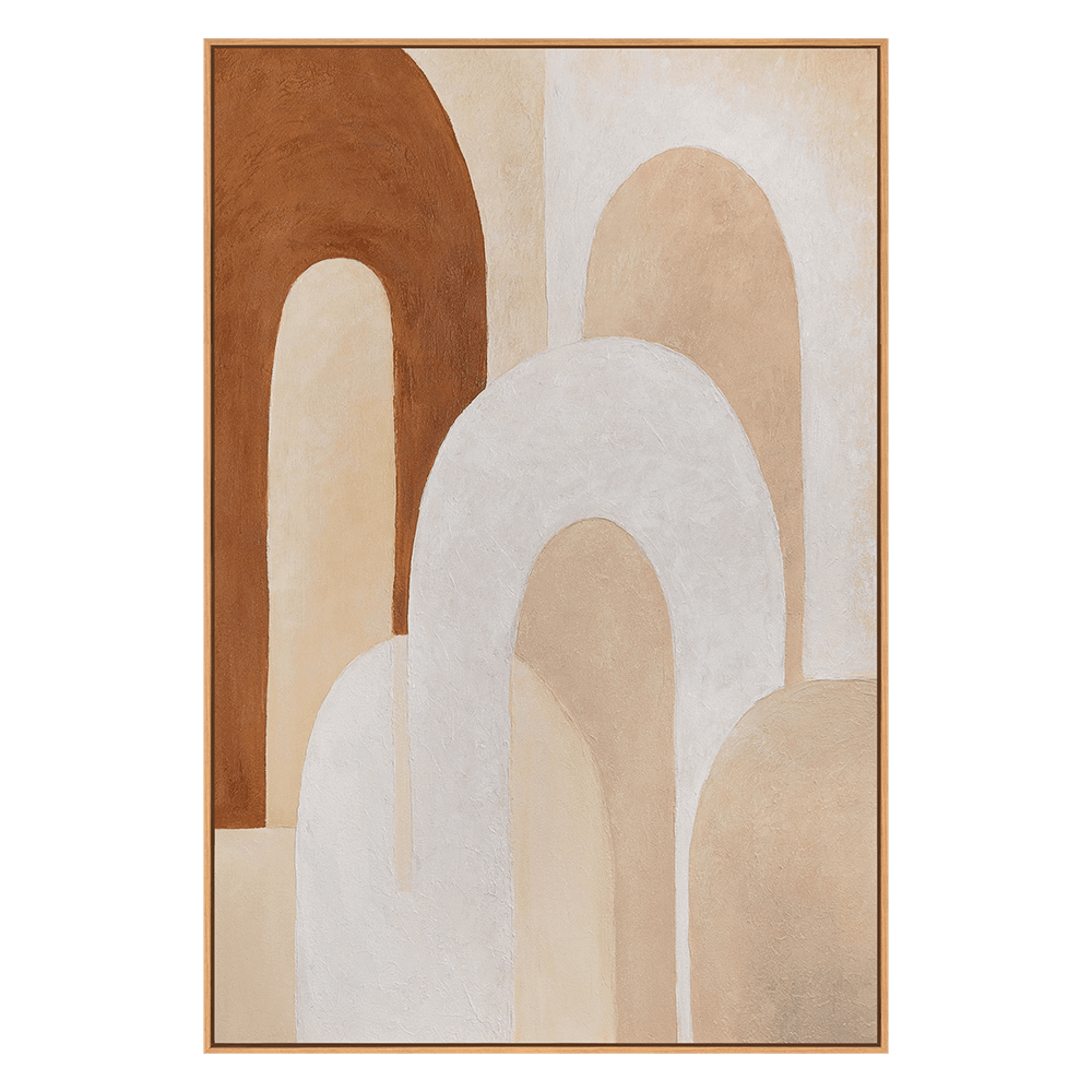 “The Breath of Architecture” is a composition that conveys the calmness and grandeur of forms. Rhythmic arches, executed in shades of sand, cream, and terracotta, create a sense of movement of air and light. The painting combines soft lines and strong structure — just like in real architecture, where space lives in every curve.