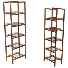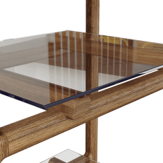 The bronze glass shelves and the cabinets are laid on a light solid wood structure and supported by sleek metal feet, creating an elegant design that gives the illusion of floating ever so slightly. The combination of glass, wood, and metal offers a refined aesthetic that is both modern and timeless, allowing the piece to seamlessly complement a variety of interiors, from contemporary to more traditional spaces.