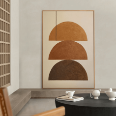 Three Horizons is a modern abstract composition based on simple forms and the harmony of warm colors. Three semicircles in golden ochre tones symbolize calm, balance, and gradual movement, creating an effect of meditative contemplation. The laconic plot and textured surface add expressiveness and a modern character to the work.