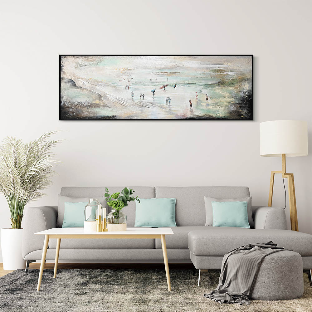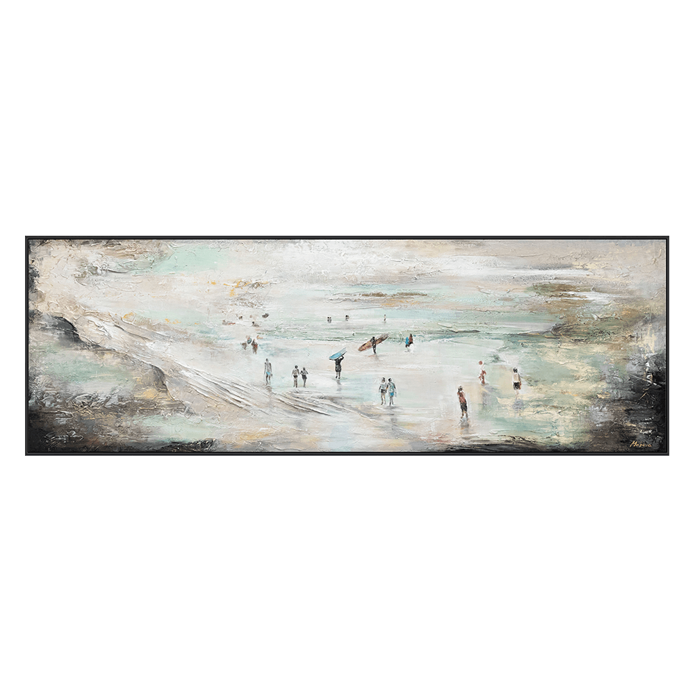 The gentle glow of the waves, the transparent greenish hues of the water and the soft blurred horizon create the effect of a memory or a dream. Small figures of people scattered along the shore, depicted with deliberately vague strokes - these are only hints of movement, presence, moments. The background is covered with layered paste with pearlescent light and a light haze, which conveys a deep peace and a sense of freedom.