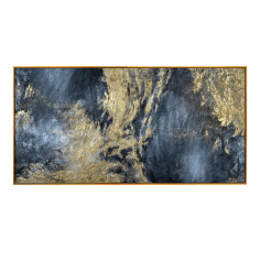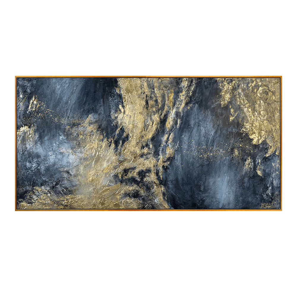 This abstract composition is striking in its depth of dark blue and graphite hues, through which chaotic flashes of gold break through. Rich textures, vertical strokes and the soft glow of metallic accents create an atmosphere of inner strength and silent contemplation. The painting evokes the emotion of the calm before the storm or a moment of revelation.