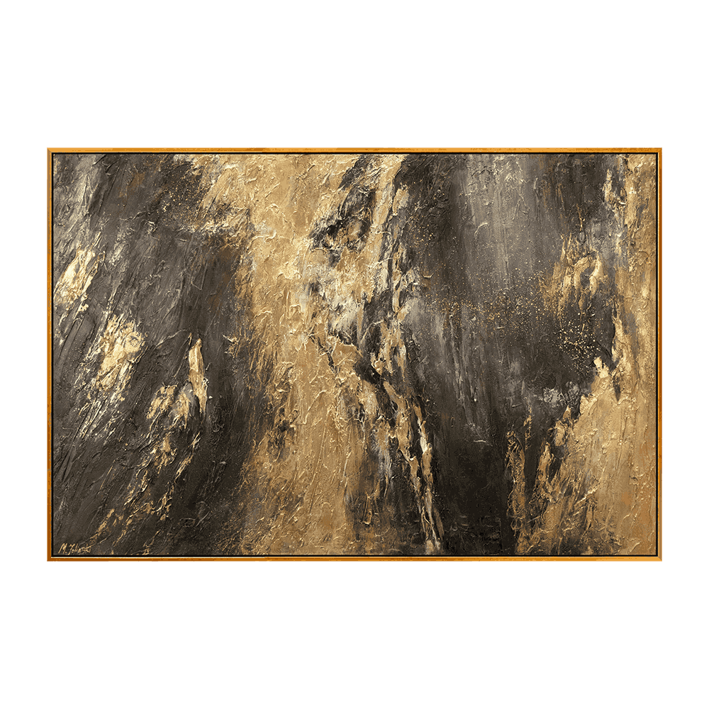 The work intertwines streams of rich golden paste and dark graphite shades, which seem to cut through each other with the tension of a lava flow. The composition is built on the contrast of light and shadow, and massive strokes create the illusion of a natural fault, rocks or the movement of energy in the bowels of the earth. The texture is extremely rich: in some areas the golden layer seems to splash out, creating the effect of a living glow.