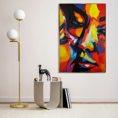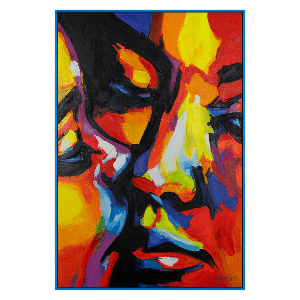 This canvas is created through an intense play of colors and lines: burning strokes of red, yellow, blue and black form a fragmented face, full of emotional tension. The image seems to be broken into parts that merge into a powerful visual wave - anger, sadness, strength, memory. The composition is energetic, dynamic, with inner drama.