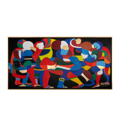 This painting is built on a dynamic interweaving of human figures stylized in colored geometric shapes. Blue, red, yellow, white, and green form a rhythmic wave of movement that resembles a dance or a march. The absence of faces and detail emphasizes the idea of unity, movement, and an abstract perception of society.