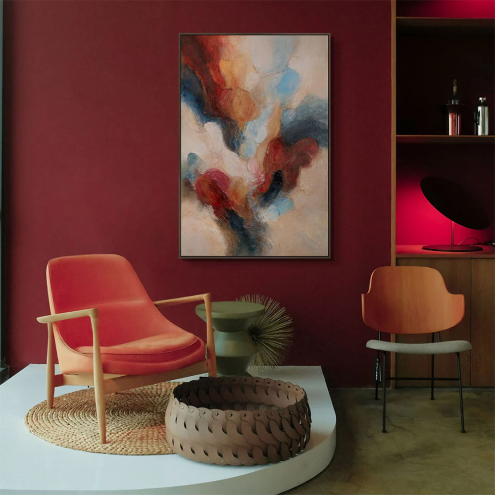 “Music in Color” is an abstract composition where red, blue, and golden hues intertwine in expressive movement, creating the impression of an explosion of energy and a harmonious play of colors. Warm and cool tones meet in a dynamic rhythm reminiscent of live music improvisation on canvas. The textured surface emphasizes the power of the brushstrokes and adds a special depth and expressiveness to the painting.
