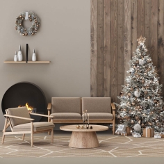 This modern and cozy Christmas living room features neutral tones, a festive tree with golden decorations, a circular fireplace, and light wood furniture, all set on a geometric patterned rug.