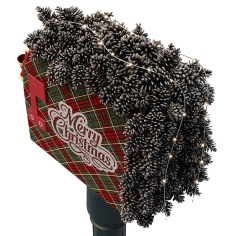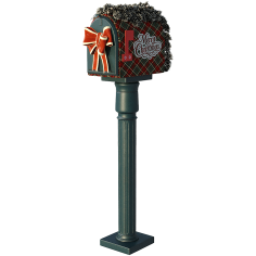 A festive Christmas mailbox mounted on a classic post, decorated with red tartan panels, pine garland, and a large ribbon bow. A cozy holiday accent, perfect for winter scenes and seasonal decor.