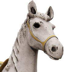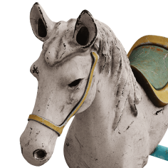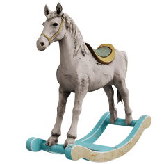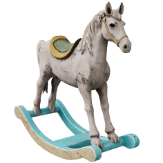 Винтажная деревянная лошадка-качалка с эффектом состаренной краски, нежными пастельными тонами и деталями ручной работы. Имеет изогнутое основание для качания, потертую текстуру и классический ностальгический дизайн, подходящий для детских комнат или декоративных сцен.