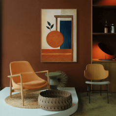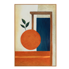 “Fruit Balance” is an artistic metaphor for harmony and freshness. Geometric shapes are combined with natural motifs, and the rich orange color creates a feeling of warmth and energy. The contrast with the deep blue background adds depth to the painting, and the green leaf emphasizes its naturalness.
